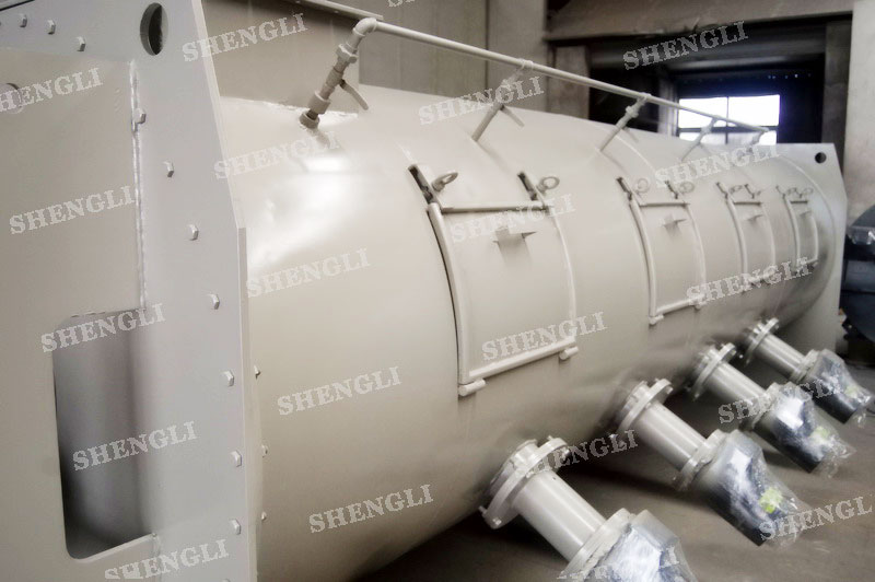 描述:連續式犁刀攪拌機臥式安裝,進行連續式生產模式,內部配置連續犁刀配合高速飛刀能夠有效分散,混合物料。設備主軸采用填料密封,桶側開設檢修門,搭載噴液噴霧裝置。