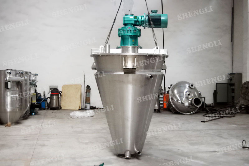 描述:雙螺旋錐形混合機內部安裝非對稱傾斜螺旋,雙螺旋自身旋轉,提升物料,并有公轉減速箱驅動,沿錐體中心軸公轉,360度攪拌物料,擁有非破壞性攪拌以及快速且無殘留卸料的特點。該設備配置內加熱夾套,內外表面做拉絲處理,錐體中心軸加噴液裝置。