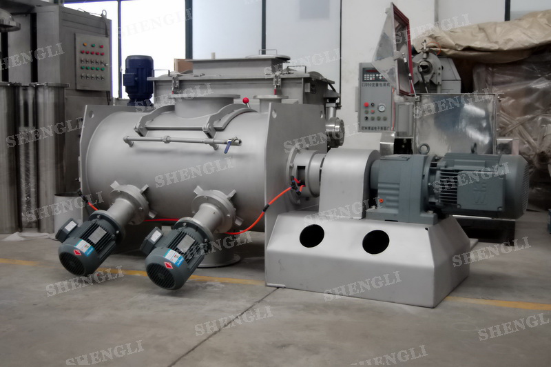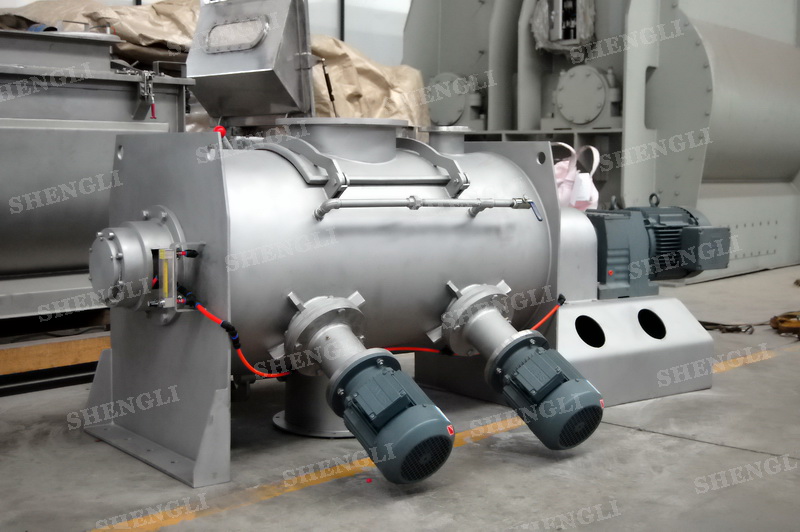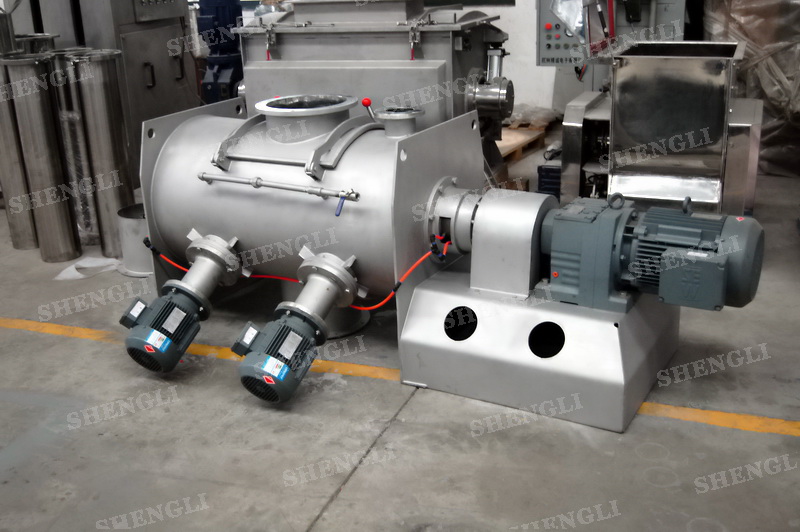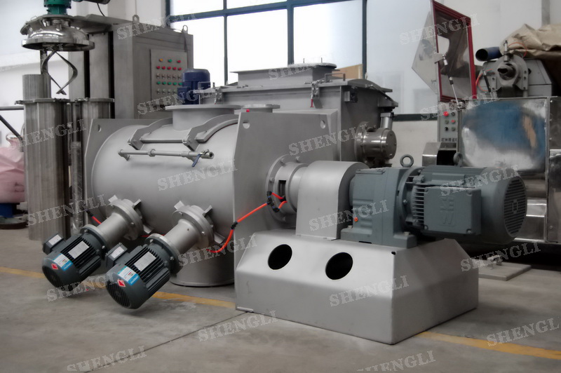 工作原理:犁刀式混合機采用臥式圓柱筒體,內設平行主軸,主軸上安裝若干犁式刀頭,通過較快的旋轉速度,分割、重合物料,實現(xiàn)快速攪拌的功能,常結合1500-3000轉高速剪切飛刀相互作用。