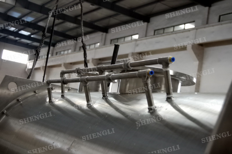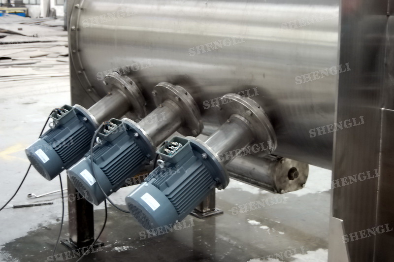工作原理:犁刀混料機采用臥式圓柱筒體,內設平行主軸,主軸上安裝若干犁式刀頭,通過較快的旋轉速度,分割、重合物料,實現快速攪拌的功能,常結合1500-3000轉高速剪切飛刀相互作用。