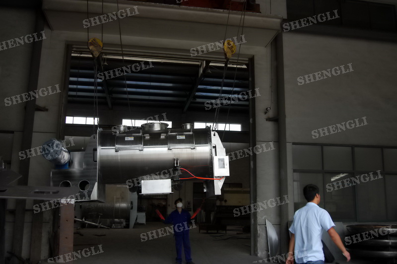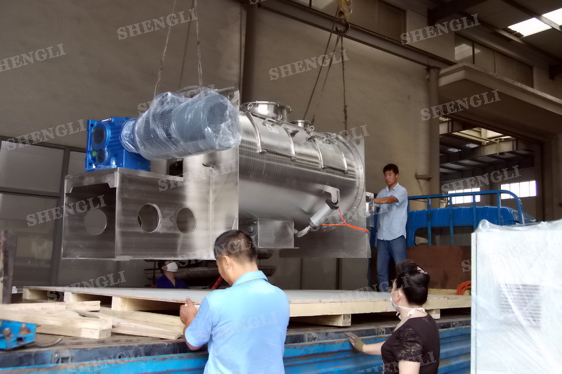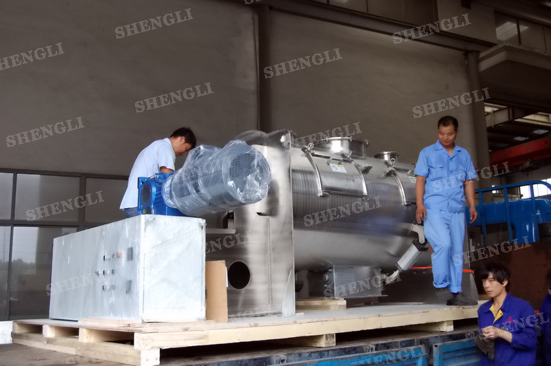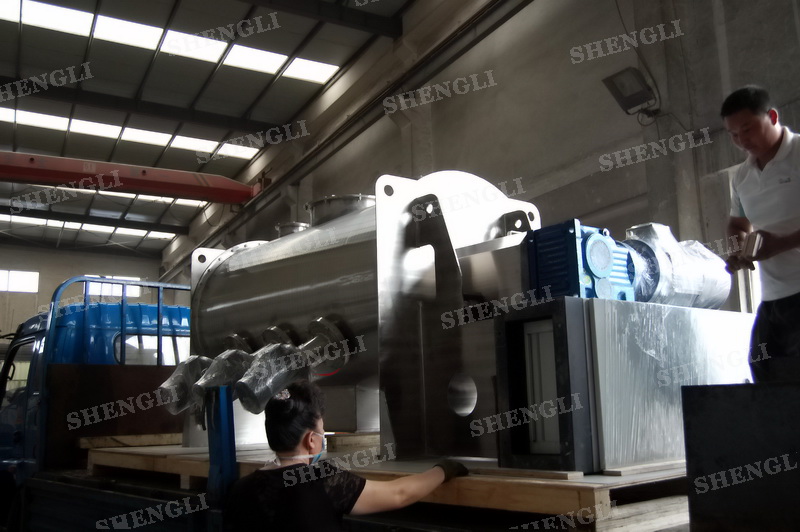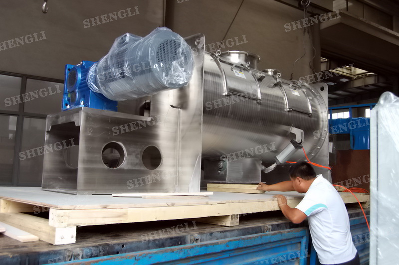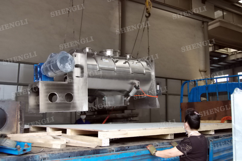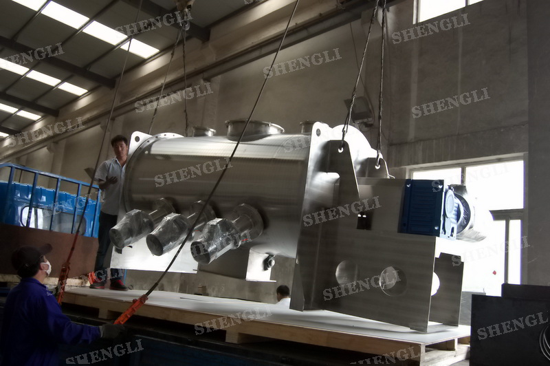 工作原理:犁刀攪拌機采用臥式圓柱筒體,內設平行主軸,主軸上安裝若干犁式刀頭,通過較快的旋轉速度,分割、重合物料,實現快速攪拌的功能,常結合1500-3000轉高速剪切飛刀相互作用。