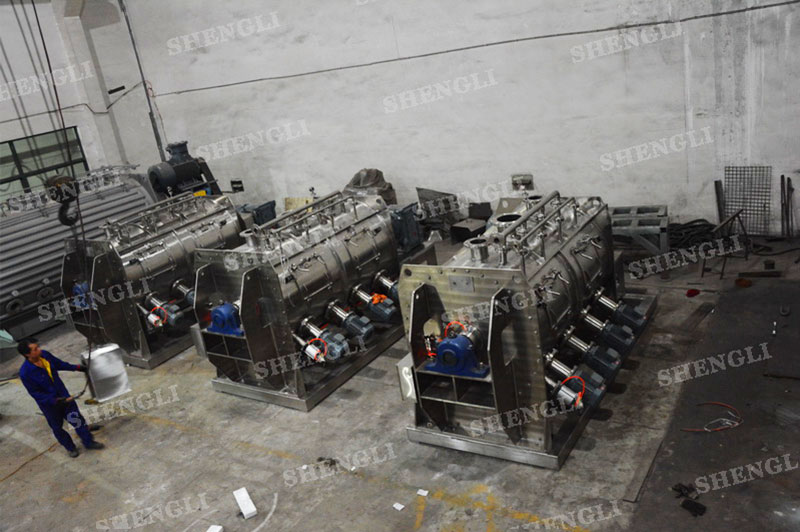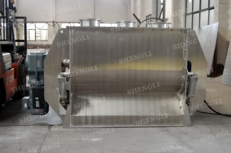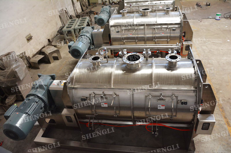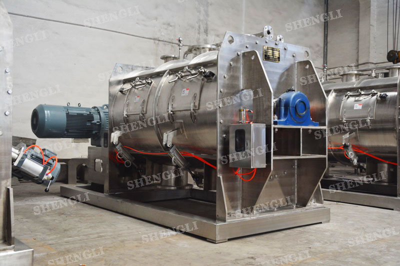 工作原理:臥式犁刀攪拌機采用臥式圓柱筒體,內設平行主軸,主軸上安裝若干犁式刀頭,通過較快的旋轉速度,分割、重合物料,實現快速攪拌的功能,常結合1500-3000轉高速剪切飛刀相互作用。