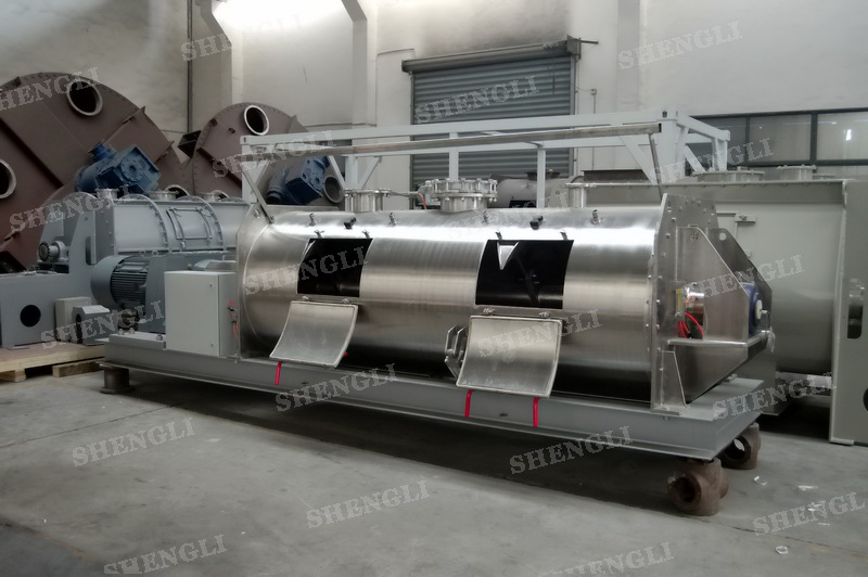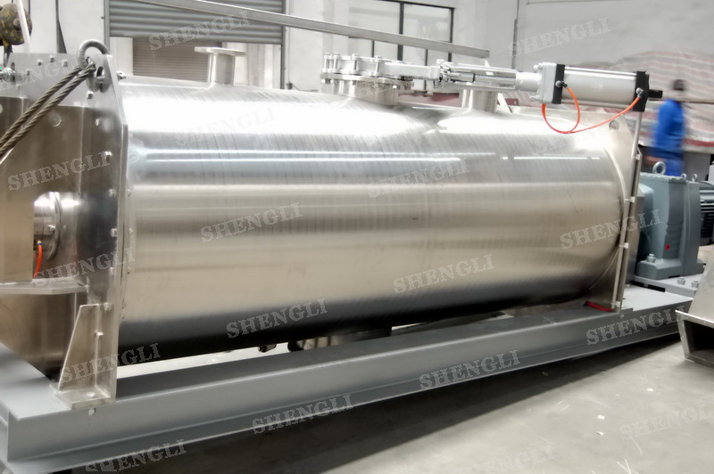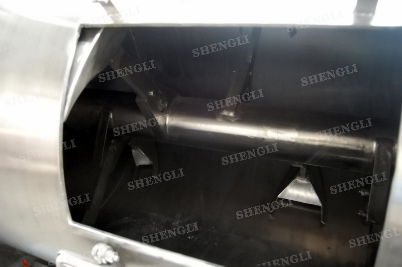 工作原理:犁刀臥式混合機采用臥式圓柱筒體,內設平行主軸,主軸上安裝若干犁式刀頭,通過較快的旋轉速度,分割、重合物料,實現快速攪拌的功能,常結合1500-3000轉高速剪切飛刀相互作用。