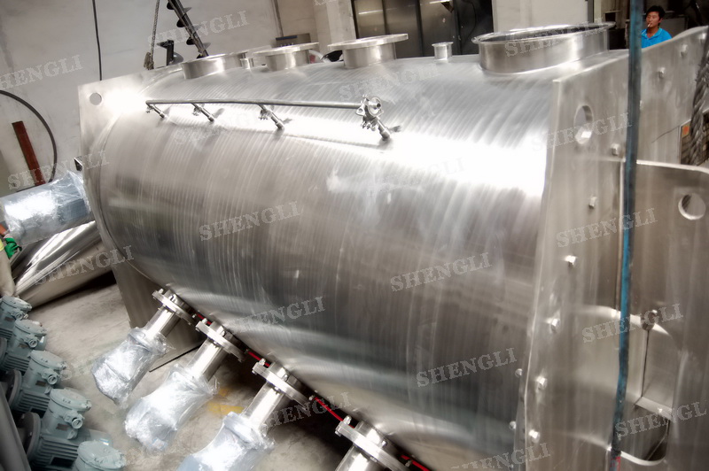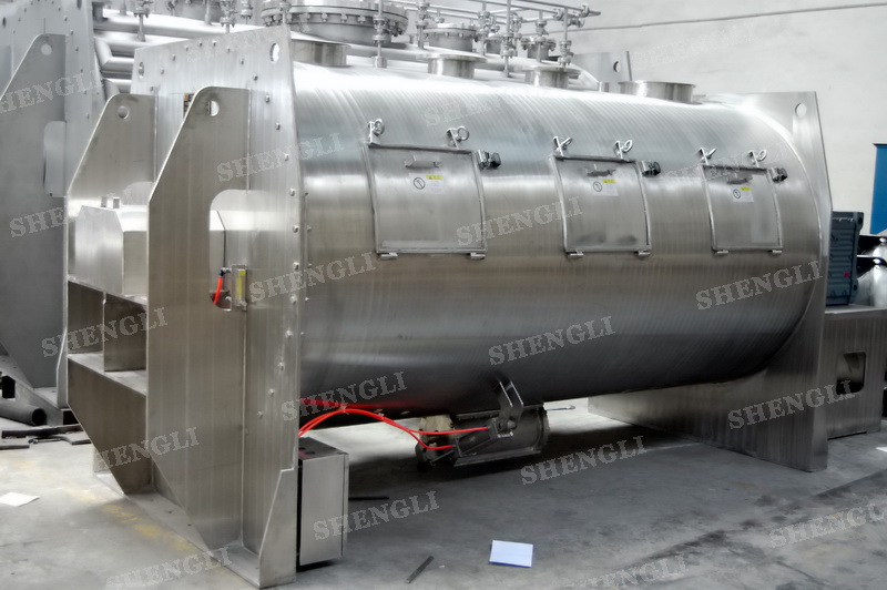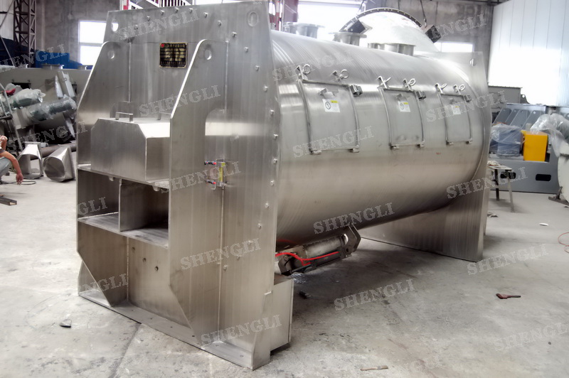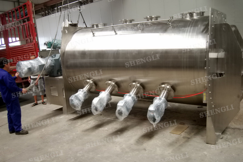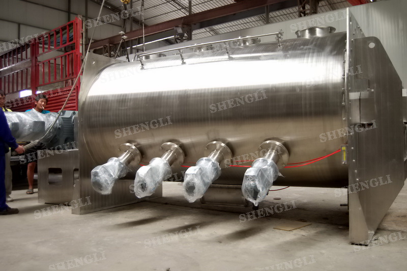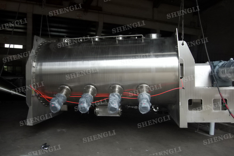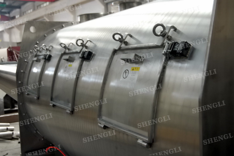 工作原理:犁刀式攪拌機采用臥式圓柱筒體,內設平行主軸,主軸上安裝若干犁式刀頭,通過較快的旋轉速度,分割、重合物料,實現快速攪拌的功能,常結合1500-3000轉高速剪切飛刀相互作用。