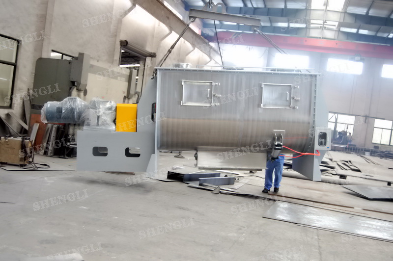 工作原理:螺帶臥式攪拌設備采用U型筒體,內裝平行主軸,主軸上安裝正反雙向的盤條螺帶,不同維度螺帶分內螺帶與外螺帶,物料在螺帶的驅使下反復參混,能夠快速高效的混合。